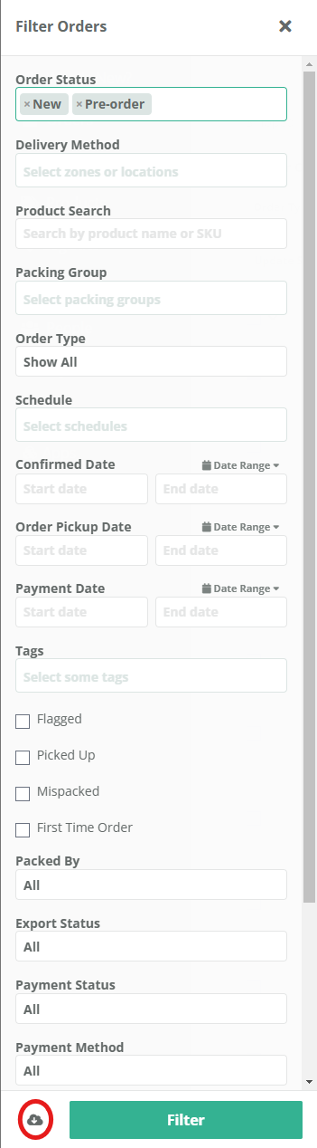 Once your desired orders are filtered, click on the cloud icon located in the bottom left corner of the screen to export them.